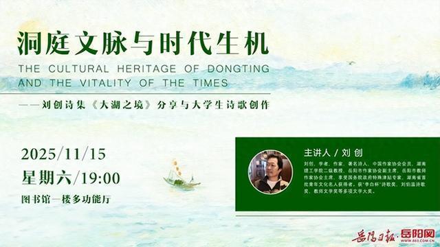 11月15日晚,湖南理工学院图书馆多功能厅内气氛热烈,“洞庭文脉与时代生机——刘创诗集《大湖之境》分享会”在此举行。中国作家协会会员、湖南理工学院二级教授刘创与百余名师生诗歌爱好者展开了一场深度的文学对话。据悉,刘创的“大湖系列诗歌”分享活动是湖南理工学院南湖学堂的品牌活动,自2021年起已连续举办多届。