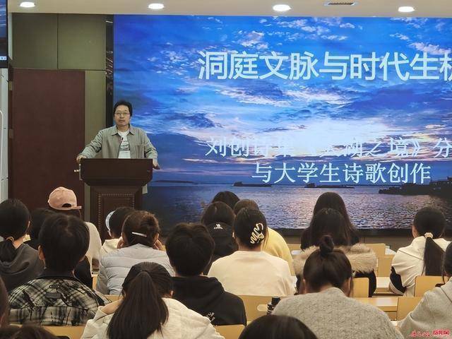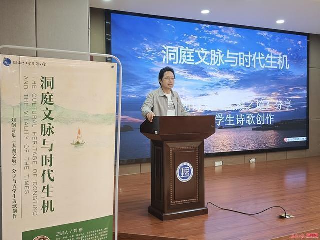 在分享环节中,刘创教授从洞庭文脉的千年积淀讲起,详细介绍了洞庭地域文化基因,特别强调了“水”与“诗”的共生传统,并阐释了当代书写洞庭的文化价值。他结合“湖南省作家协会扶持项目”《大湖之境》诗集的具体内容,解析了作品如何传承洞庭文脉,真实记录洞庭生态之美与生态思考,展现了“文”与“境”的深度融合。针对大学生诗歌创作,刘创教授提出了“在地性”写作路径,以诗集为范本,引导同学们思考如何挖掘洞庭等地域文化资源,将文脉传承与生态观察融入创作,鼓励大家争做地域文脉的“寻根者”、生态现实的“观察者”和文化与生态的“思考者”。