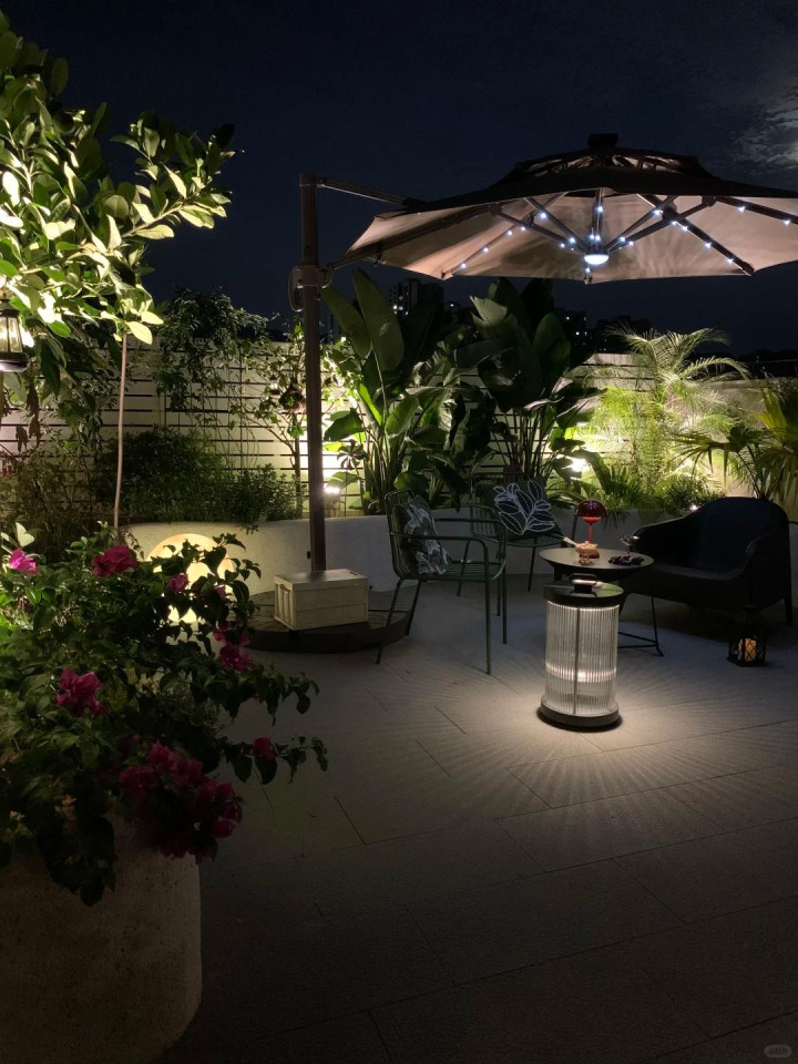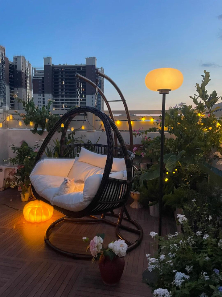 夜晚,关掉客厅的灯,搬一把摇椅到露台,听楼下车声渐远,看对面楼里的灯光一盏盏熄灭——这一刻,世界仿佛只剩下你和这片小天地。